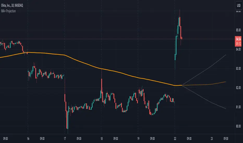 The "MA+ Projection" indicator is designed to visualize the potential future direction of a moving average, taking into account the impact of historical data loss. It is primarily aimed at providing a practical perspective on how moving averages could evolve as older data points are no longer considered.