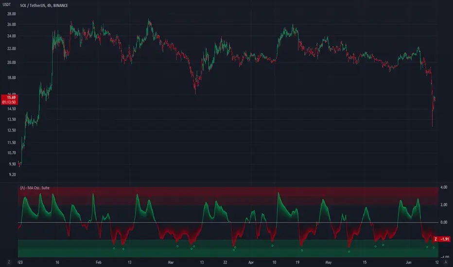 The Regularized MA Oscillator Suite calculates the moving average (MA) based on user-defined parameters such as length, moving average type, and custom smoothing factors. It then derives the mean and standard deviation of the MA using a normalized period. Finally, it computes the Z-Score by subtracting the mean from the MA and dividing it by the standard deviation.