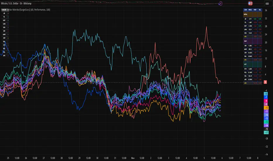 This script provides a visual and data-driven overview of the performance of major cryptocurrencies, grouped by sector — such as Infrastructure, DeFi, NFTs, and ENS — allowing traders to track which sectors are leading or lagging the market in real time.