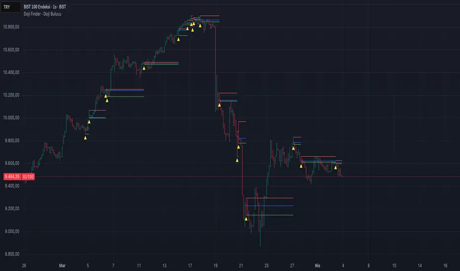 Doji candles are marked on the chart with small yellow triangles (optional).