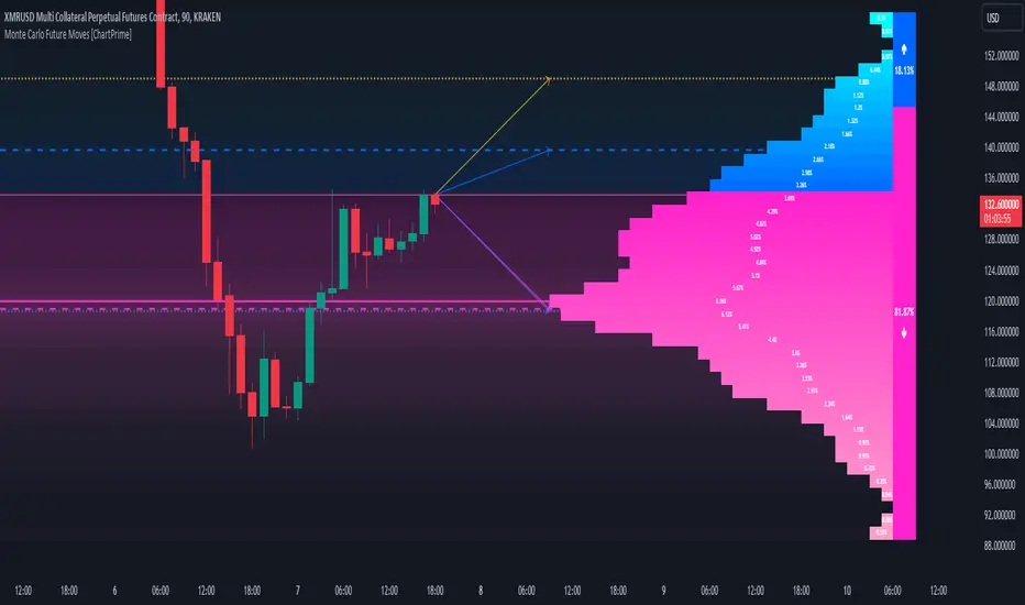 The Monte Carlo Future Moves (ChartPrime) indicator is designed to predict future price movements. It simulates various possible price paths, showing the likelihood of different outcomes. We have designed it to be simple to use and understand by displaying lines indicating the most likely bullish and bearish outcomes. The arrows point to these areas making it intuitive to understand. Also included is extreme price levels shown in blue and yellow. This is the most likely extreme range that the price will move to. The outcome distribution is there to show you the range of outcomes along with a visual representation of the possible future outcomes. To make things more user friendly we have also included a representation of this distribution as a background heatmap. The brighter the price level, the more likely the price will end at that level. Finally, we have also included a market bias indication on the side that shows you the general bullish/bearish probabilities.