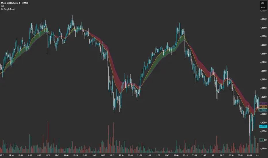 OI: Simple Band is a very simple, open-source overlay that draws a two-line moving-average band and fills the space between them to highlight trend bias and momentum shifts at a glance.