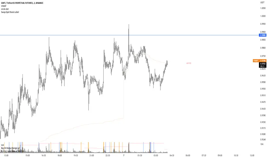 This script calculates the basis between the Binance Future and Binance Spot market for the coin you are currently viewing and paints a label on the chart which displays the percentage difference between future and spot. If the future is trading below the spot market the text will be red indicating backwardation and if the future is trading above spot, it will be green indicating contango. Please note this script will only work on Binance perps against Binance spot. The script will change based on what perp you are looking at, no inputs are required.