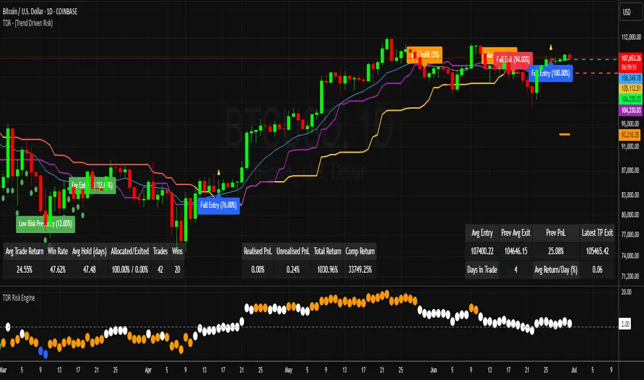 The TDR Risk Engine is a powerful market risk and momentum visualization tool. It provides two advanced risk models—TDV Extreme and PPO—to help traders identify high and low risk zones, potential market extremes, and optimal trade timing. The indicator is designed for use on any asset or timeframe and is highly customizable.
