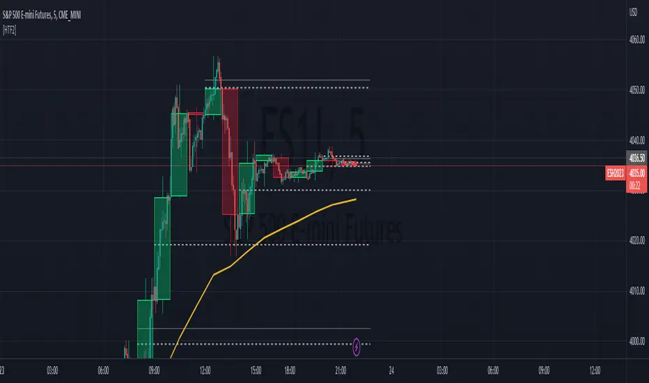 HTF Tool allows Users to display Higher Timeframe(HTF) Candles on their Chart with retracement lines drawn from the (High/Low) range of the HTF candle, as well as a live HTF MA.