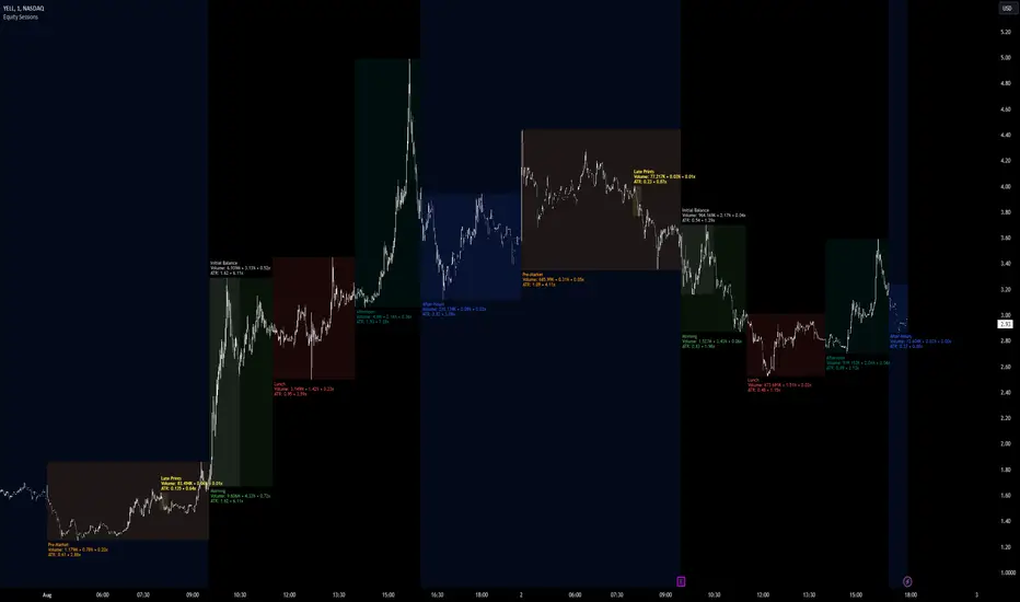 This indicator was made specifically for equity markets which have pre-market and after-hours trading, though can be used for any other markets without these sessions, there are many other session indicators better suited for those markets. What makes this indicator different to the hundreds of session indicators out there will be highlighted in bold in the Features section below.