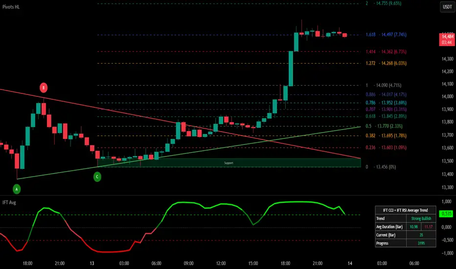 IFT CCI + IFT RSI Average is a momentum-based oscillator that combines the Inverse Fisher Transform (IFT) of the Commodity Channel Index (CCI) and the Relative Strength Index (RSI) into a single, normalized impulse signal.