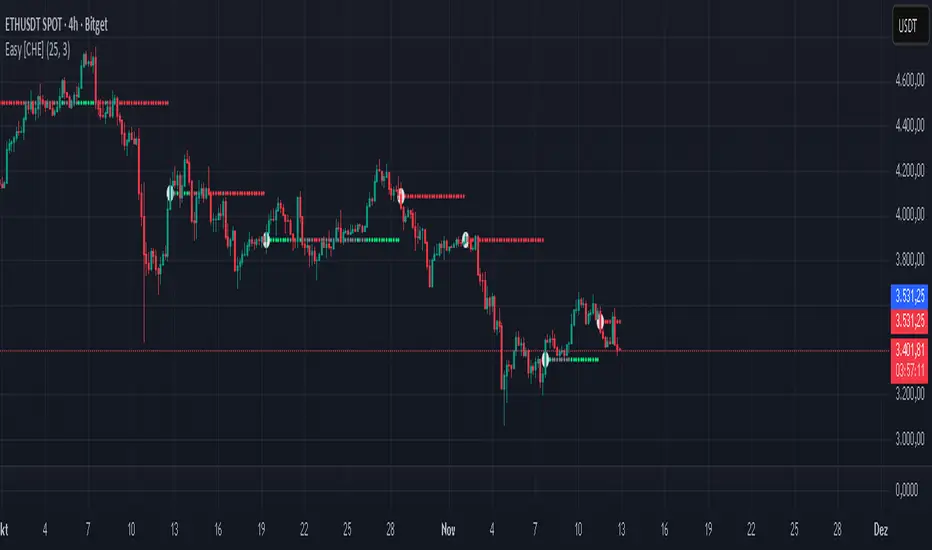 Easy [CHE] — Minimalist Pine Script for detecting EMA direction changes to define fixed price zones for simple support and resistance visualization, ideal for manual trading workflows.