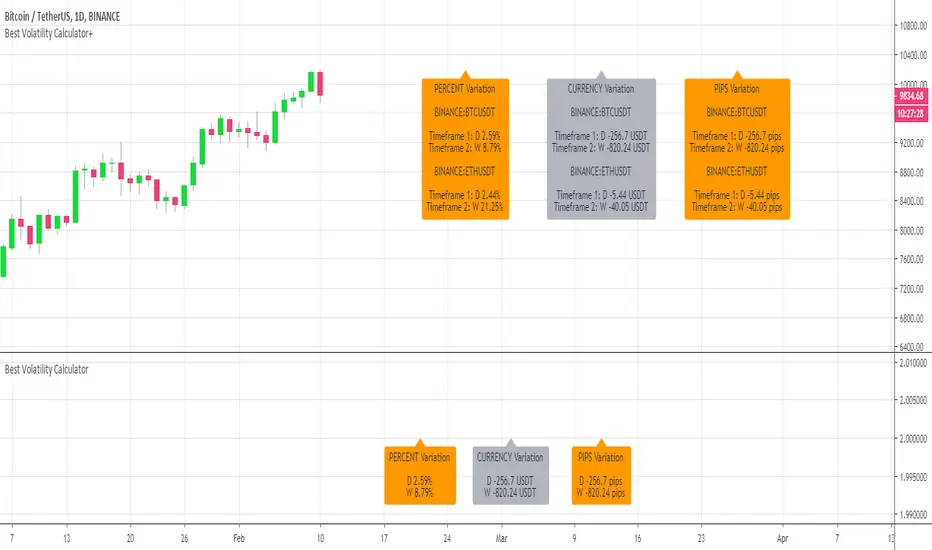This indicator shows the average volatility, of last N Periods, for the selected time frames and for 2 selected instruments.