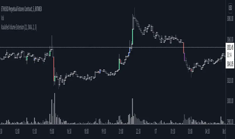 Bar colours based on extensions from volume Z-Score. Large volume candles can often signal exhaustion or show market strength in reversals or breakouts. Candles not supported by rising volume are coloured black while those that are retain their colouring.