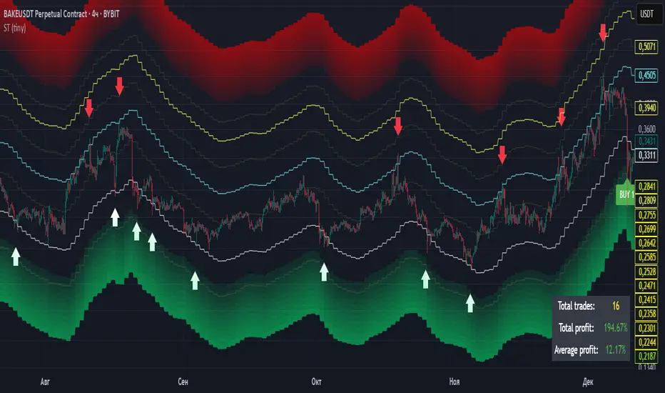 It uses the daily timeframe as the basis for displaying levels. For each cryptocurrency, a unique deviation coefficient is calculated for each level. Essentially, we take two deviation zones—the buy zone and the sell zone—treating them as 0 and 1, respectively. From there, we can plot internal levels based on the Fibonacci sequence.