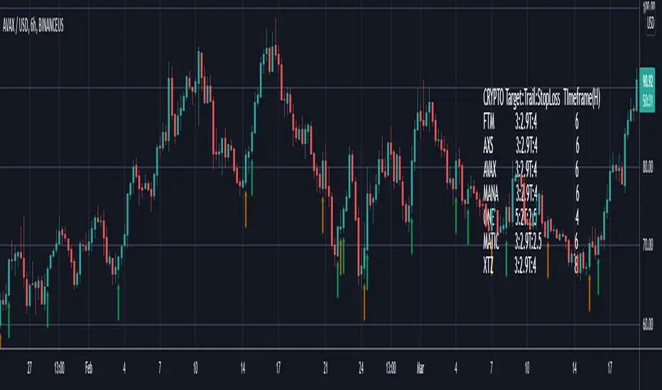 This is an early prototype that is filtered to the following tested cryptos against the specified chart timeframes and using the expressed target/trail/stoploss logic.
