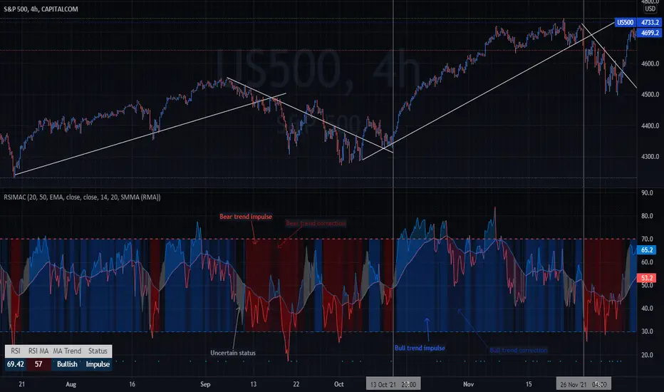 This script is an improved version of the RSI indicator, using a moving average on the RSI itself, as well as two other moving averages used to determine the current trend.