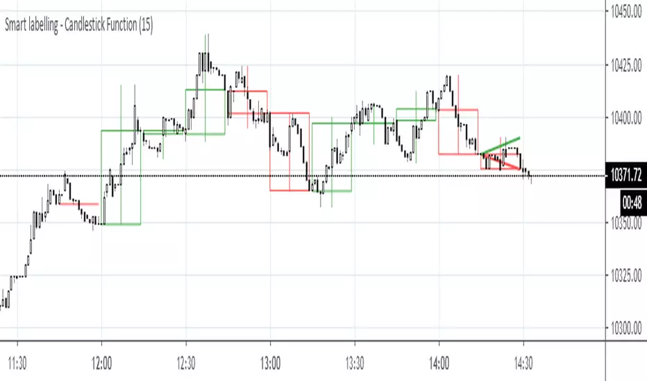 Oftentimes a single look at the candlestick configuration happens to be enough to understand what is going on. The chandlestick function is an experiment in smart labelling that produces candles for various time frames, not only for the fixed 1m, 3m , 5m, 15m, etc. ones, and helps in decision-making when eye-balling the chart. This function generates up to 12 last candlesticks , which is generally more than enough.