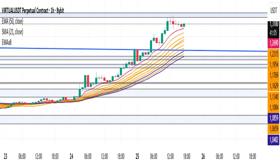 This indicator provides a highly flexible system of eight fully customizable moving averages (MAs), allowing traders to visualize short-, medium-, and long-term market trends with precision and adaptability. Each of the eight moving averages can be independently configured by the user, both in period length and type — supporting either Simple Moving Average (SMA) or Exponential Moving Average (EMA).