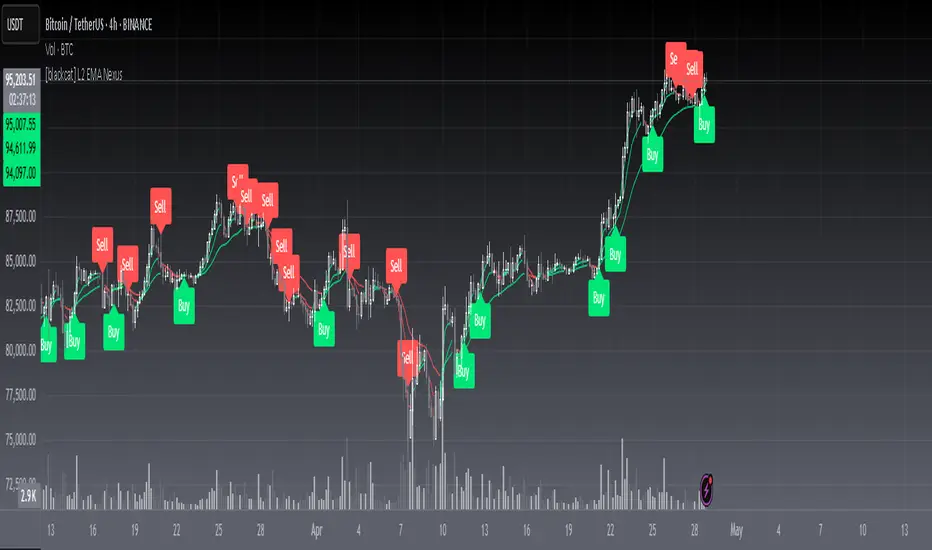 The [blackcat] L2 EMA Nexus is a comprehensive trading indicator that utilizes a three-tiered Exponential Moving Average (EMA) system to identify potential trading opportunities. This script combines technical analysis with robust risk management features to help traders make informed decisions.