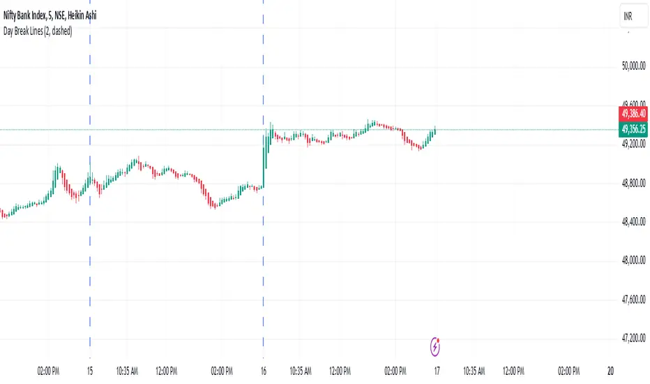 The Day Break Lines Indicator is a simple tool designed to enhance your chart analysis by visually marking the start of a new trading day with vertical lines. This is particularly useful for intraday traders and those analyzing time-based price movements.