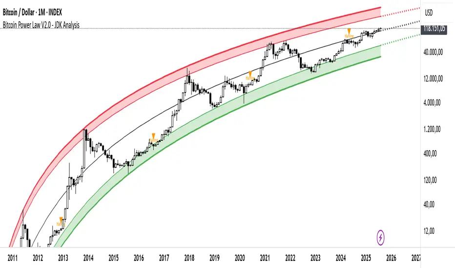 This very simple script visualizes Bitcoin’s long-term price behavior using a logarithmic regression model designed to reflect the cyclical nature of Bitcoin’s historical market trends. Unlike typical technical indicators that react to recent price movements, this tool is built on the assumption that Bitcoin follows an exponential growth path over time, shaped by its fixed supply structure and four-year halving cycles.