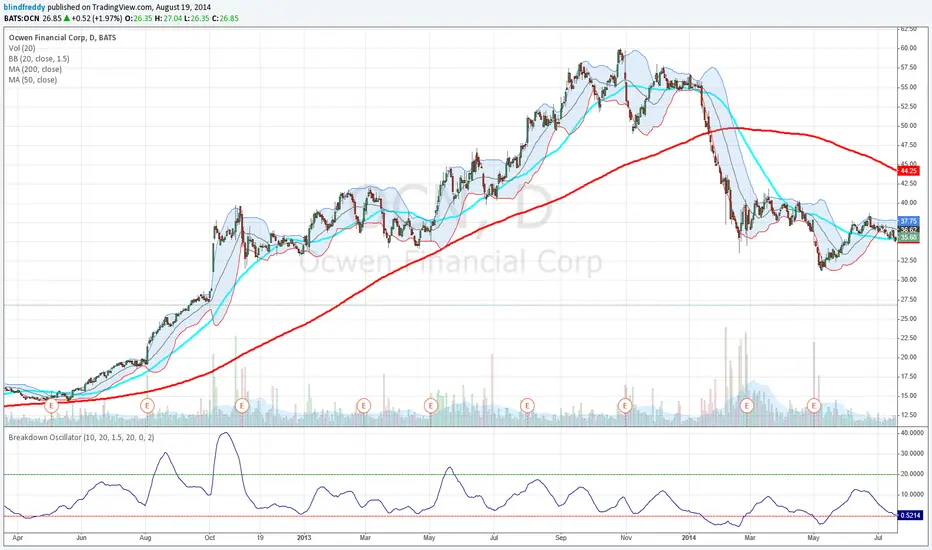 This is an indicator I made, based on the observation that the longer the price action hugs the bottom bollinger band, the greater the danger of a breakdown occurring (price decline). Essentially its a moving average of the difference between close price and the bottom bollinger band, divided by the bottom bollinger band; I like to use 1.5 standard deviations for the 20 day bollinger band. When it crosses below zero there is increased danger of a breakdown, although of course it could turn right around and go up again. In fact if it does turn around sharply from near zero it can be a good time to buy in the context of a pullback within an uptrend. I also have included the 'slope factor' which makes the indicator more negative based on the rate of downward movement of the bollinger moving average (set to 0 to omit this modification). The indicator can be used just for exits or can be used for entry signals when crossing over the green bar if desired. In the example chart you can see the price hitting the lower band or crossing below the 50dMA plenty of times on the way up while the indicator says to hold tight. When the breakdown comes its after a prolonged period of low volatility (band squeeze) on the lower side of the moving average so the signal comes quickly - they won't all be this good of course. This indicator can also be used to help spot potential shorting candidates.