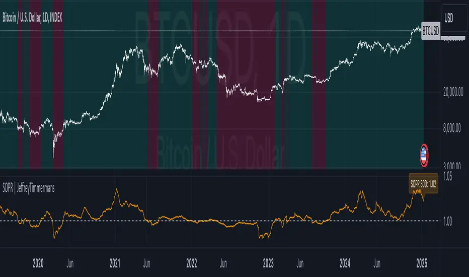 - Green: Indicates bullish conditions when the selected SOPR value is above 1.