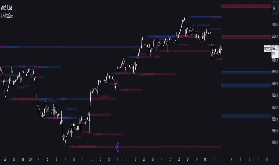 The "Support and Resistance Heatmap" indicator is designed to identify key support and resistance levels in the price action by using pivots and ATR (Average True Range) to define the sensitivity of zone detection. The zones are plotted as horizontal lines on the chart, representing areas where the price has shown significant interaction. The indicator features a customizable heatmap to visualize the intensity of these zones, making it a powerful tool for technical analysis.