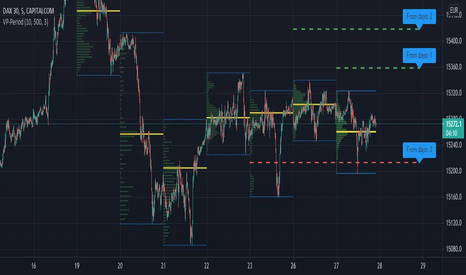 This indicator shows the volume profile by daily blocks and draws on the chart the support or resistance lines produced by the previous volume profile block. A support line will be created if in the previous block, the VPOC line was closer to the lowest price line of that block. This support line will be placed below the VPOC line, at a distance equal to the difference between the highest price of that block and the VPOC price. For the case of the resistance line, the logic applied is analogous.
