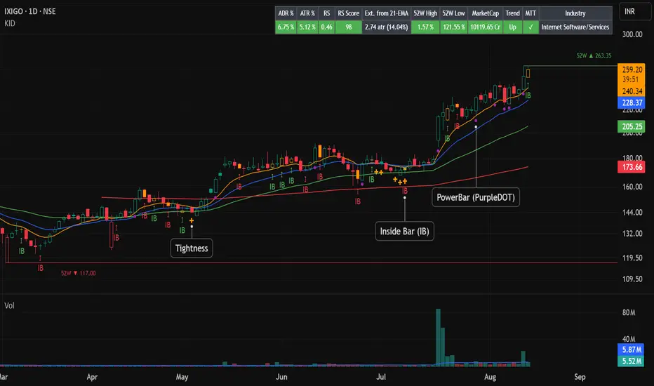⦿ PowerBar (Purple Dot): Identifies candles with a strong price move on high volume. By default, it plots a purple dot when a stock moves up or down by at least 5% and has a minimum volume of 500,000. More dots indicate higher volatility and liquidity.