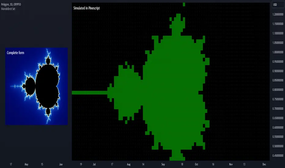 The Mandelbrot set exhibits intricate and infinitely detailed fractal patterns, characterized by self-similarity at different scales. Due to limitations in Pinescript and the number of possible table cells (Pinescript is not designed for this at all and this is merely a showcase of how flexible & great Pinescript can be it is) the resolution over this set is low.
