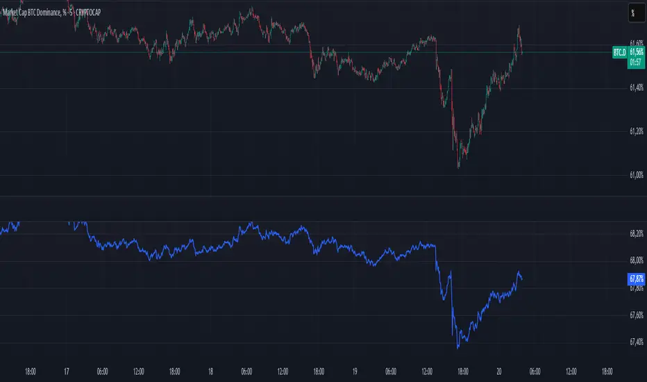 This BTC Dominance Percentage indicator calculates Bitcoin's dominance relative to altcoins, excluding stablecoins.