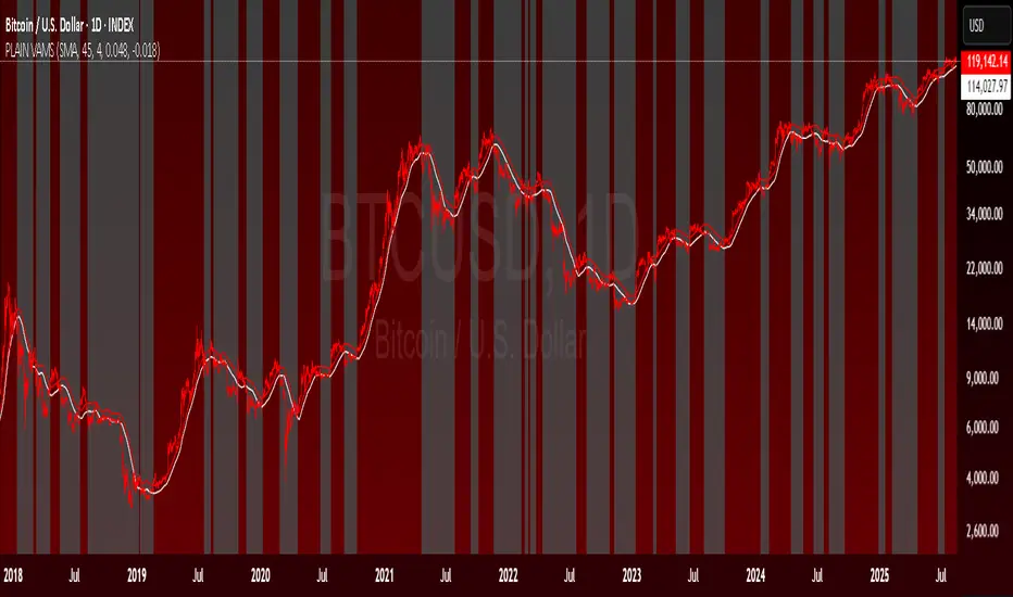 The PLAIN VAMS (Volatility-Adjusted Momentum Score) is a visual tool designed to help traders identify momentum shifts relative to prevailing volatility conditions. Unlike traditional momentum indicators, VAMS adapts dynamically to price fluctuations by comparing current price levels to volatility-based boundaries derived from customizable moving averages.