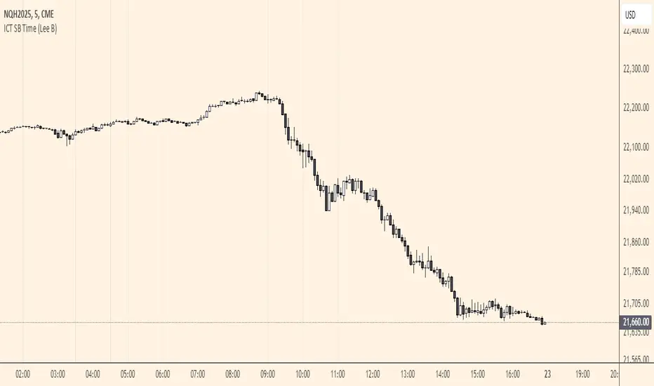 A minimal and clean indicator that simply plots the ICT Silver Bullet time windows for you on the chart with vertical lines.It also has the option to show other important times, like 00:00, 8:30, and 9:30. Toggles in settings let you change line color, turn any of them off temporarily, and can limit their visibility to only the lower timeframes for less clutter. Added the ability to toggle the SB windows off and on separately.