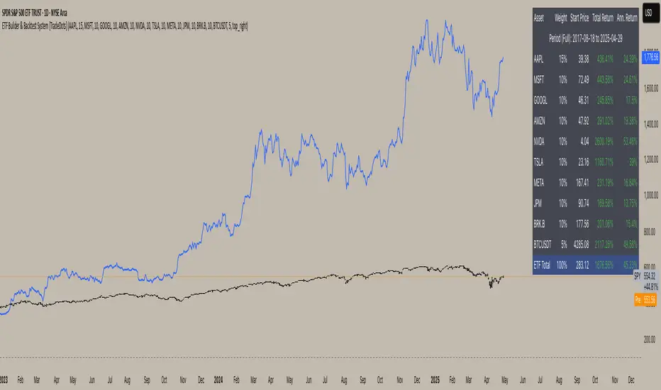 Create, analyze, and monitor your own custom “ETF-like” portfolio directly on TradingView. This script merges up to 10 different assets with user-defined weightings into a single composite chart, allowing you to see how your personalized portfolio would have performed historically. It is an original tool designed to help traders and investors quickly gauge risk and return profiles without leaving the TradingView platform.
