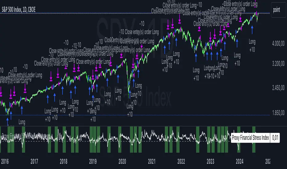 This strategy is based on a Proxy Financial Stress Index constructed using several key financial indicators. The strategy goes long when the financial stress index crosses below a user-defined threshold, signaling a potential reduction in market stress. Once a position is opened, it is held for a predetermined number of bars (periods), after which it is automatically closed.