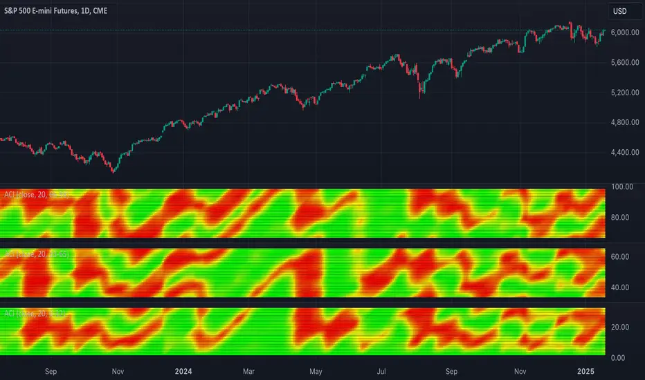 The Autocorrelation Indicator evaluates the ACF of market prices over a fixed range of lags, expressing the results as a color-coded heatmap representing a dynamic periodogram. Ehlers suggests the information from the periodogram can help traders identify different market behaviors, including: