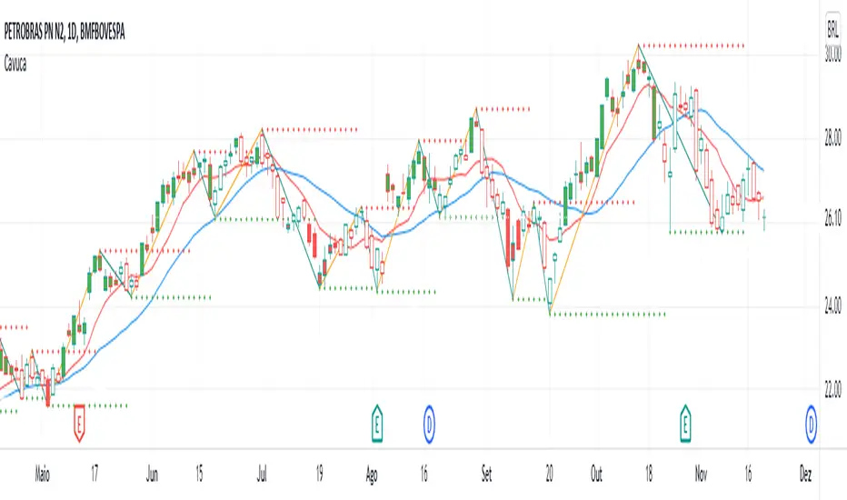Script criado por Cavuca-Trader para análise técnica de diversos ativos . Basea-se em análise de médias móveis e também em movimentos das Ondas de Elliot , sinalizando entradas e saídas através de coloração própria.