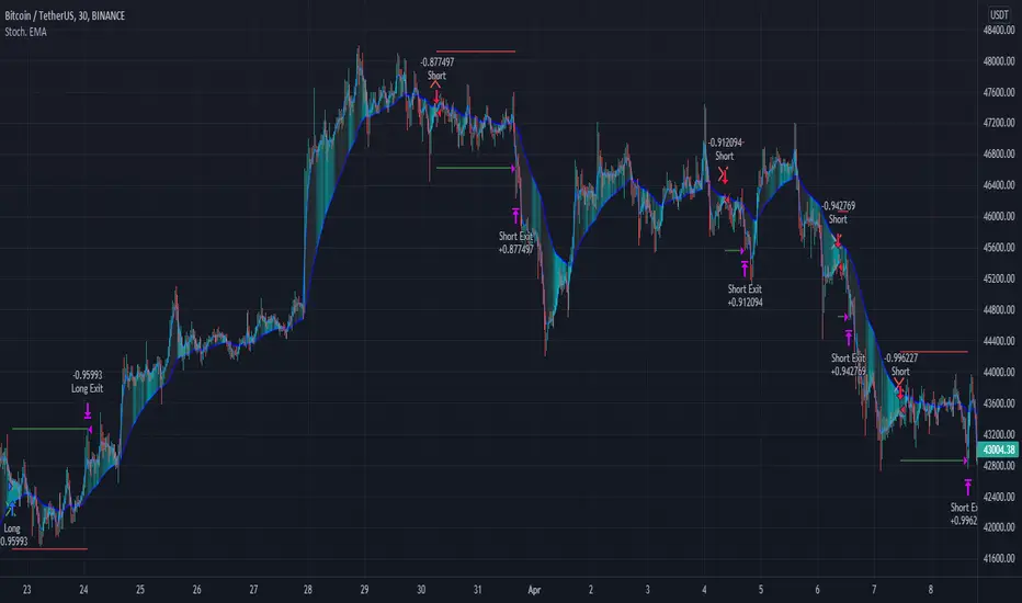 This Strategy script combines the power of EMAs along with the Stochastic Oscillator in a trend following / continuation manner, along with some cool functionalities.