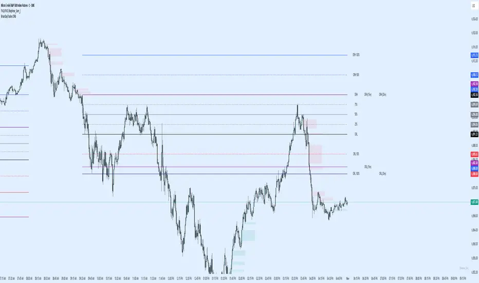 This script enables you to trade the 5m, 15m, or 30m ORB or any combination. You can select the main one you want, and see 25%, 50%, 75% lines as well as 50% and 100% extension lines above and below.