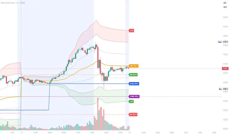VWAP with standard deviations, PDL, PDH, midnight in New York