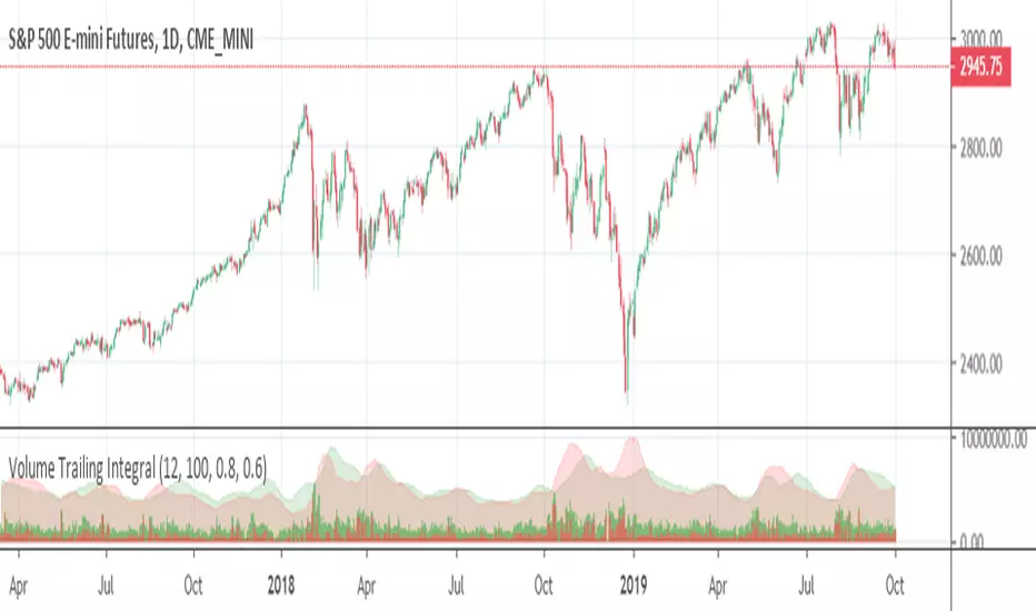 This indicator is an attempt to quantify the volume of buying vs. selling in the last N bars. The hypothesis is that on upticks, there was more bull volume than bull volume, and vice versa. "Trailing Integral" refers to the fact that this indicator shows the sum of bear and bull volume in the last N bars, which is akin to an integral of money flow.