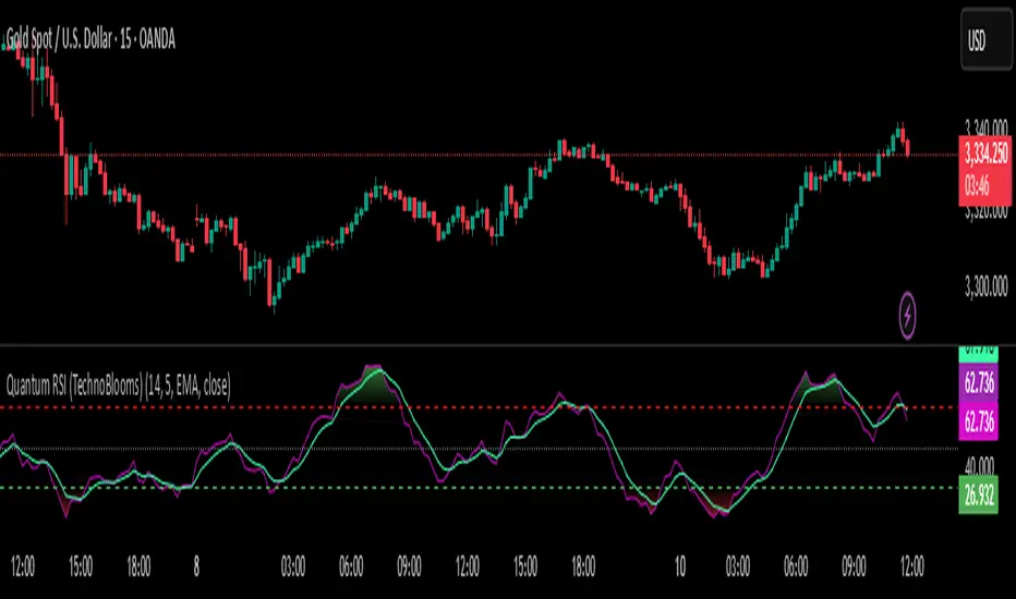 • 🧠 Smoothing with MA: Option to apply moving average (SMA/EMA/WMA/SMMA/VWMA) to the Quantum RSI line.