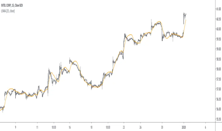 The LSMA has the form of a linear regression ax + b where x is a linear sequence 1.2.3..N and with time varying a and b, the exact formula of the LSMA is as follows :