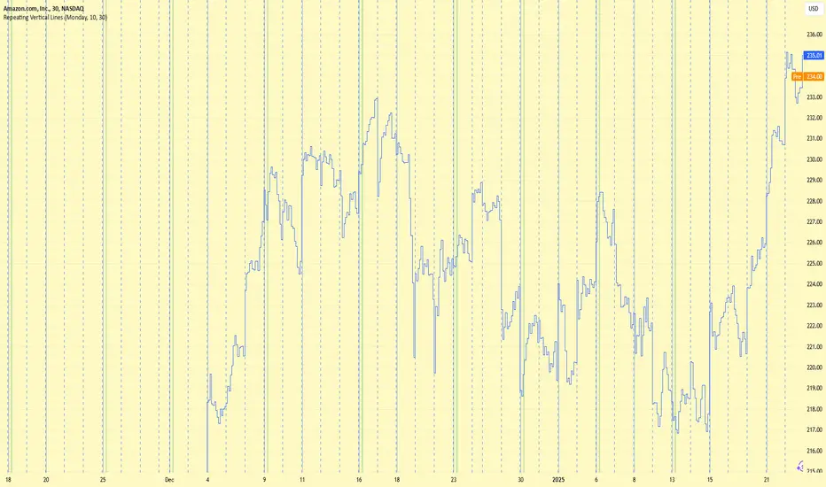 The "Repeating Vertical Lines" indicator visualizes recurring points in time on the chart by drawing background highlights based on user-defined conditions, including specific weekdays, times, or their combination. Users can customize the color and transparency of the lines for seamless chart integration.