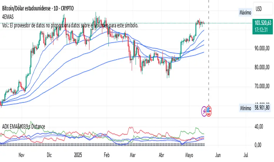 It is well known to technical analysts that the price of the most volatile and traded assets do not tend to stay in the same place for long. A notable observation is the recurring pattern of moving averages that tend to move closer together prior to a strong move in some direction to initiate the trend, it is precisely that distance that is measured by the blue ADX EMA's Distance lines on the chart, normalized and each line being the distance between 2, 3 or all 4 moving averages, with the Zero Line being the point where the distance between them is zero, but it is also necessary to know the direction of the movement, and that is where the modified ADX will be useful.This is the well known Directional Movement Indicator (DMI), where the +DI and -DI lines of the ADX will serve to determine the direction of the trend.