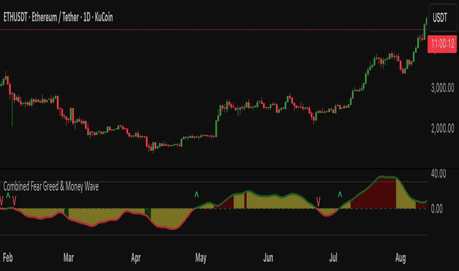 In summary, this indicator provides a combined measure of money flow momentum (MoneyWave) with market sentiment zones (fear and greed from RSI), helping identify potential market entry and exit points with visual markers and alerts [script].