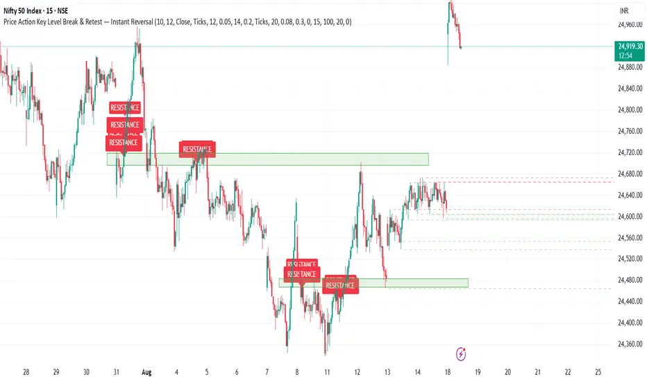 • If price breaks below ₹1,000 after holding it for multiple retests, the script automatically generates a Resistance Signal at the breach point, signaling a potential trend reversal.