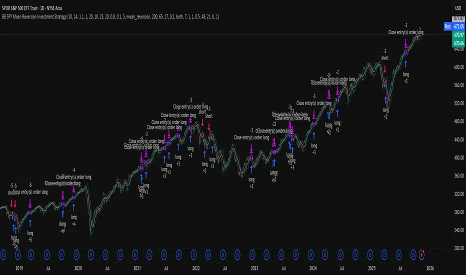 Mean reversion first, continuation second. This strategy targets equities and ETFs on daily timeframes. It waits for price to revert from a Bollinger location with candle and EMA agreement, then manages risk with ATR based exits. Uniqueness comes from two elements working together. One, an adaptive band multiplier driven by volatility of volatility that expands or contracts the envelope as conditions change. Two, a bias memory that re arms the same direction after any stop, target, or time exit until a true opposite signal appears. Add it to a clean chart, use the markers and levels, and select on bar close for conservative alerts. Shapes can move while the bar is open and settle on close.