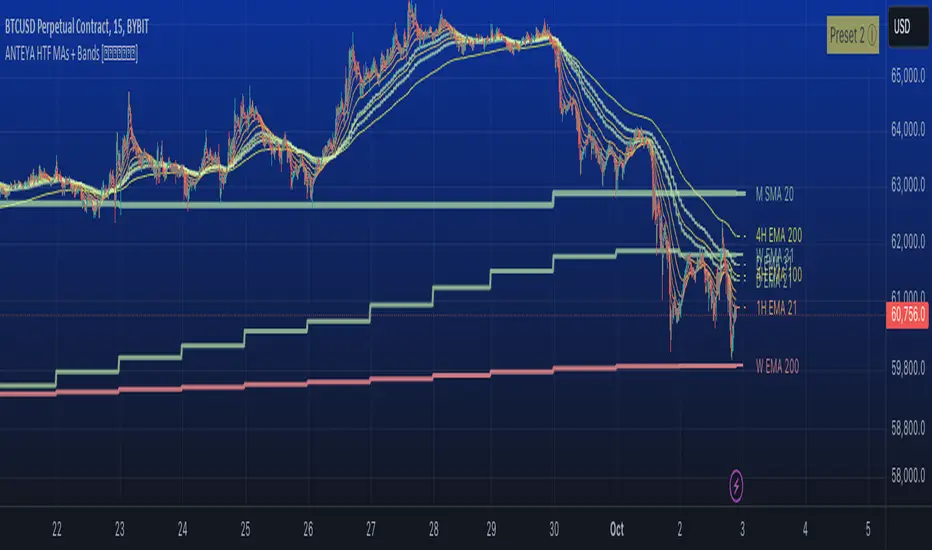 The script allows to display up to 24 moving averages ("MA"'s) across 5 timeframes plus two bands (Bollinger Bands or Supertrend or Parabolic SAR or VWAP bands) each from its own timeframe.