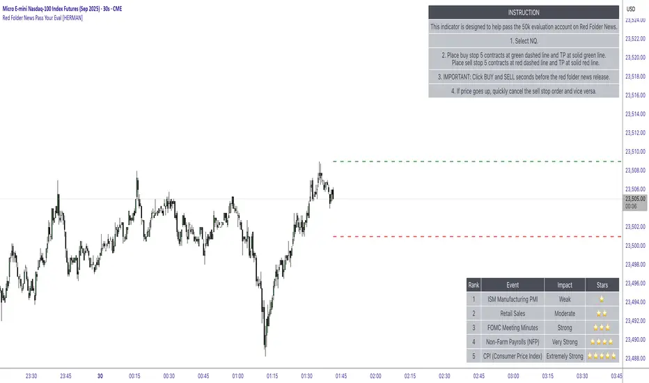 This indicator provides visual reference levels around high-impact economic news events (commonly called “red folder” news) to help traders prepare for potential market volatility.