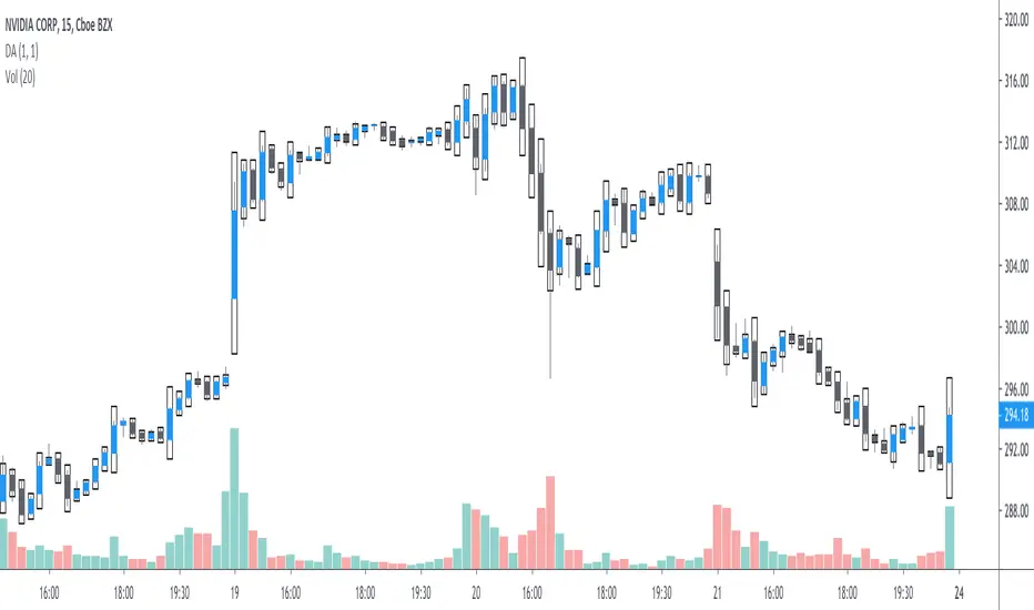 Now that the name of the indicator has been explained lets see how it works, the indicator should be overlayed directly to a candlestick chart. The proposed method don't alter the shape of the candlesticks and allow to visualize any information given by the candles. As you can see on the figure below the candle body of the proposed tool only return the border of the candle, this allow to show the high/low wick of the candle.
