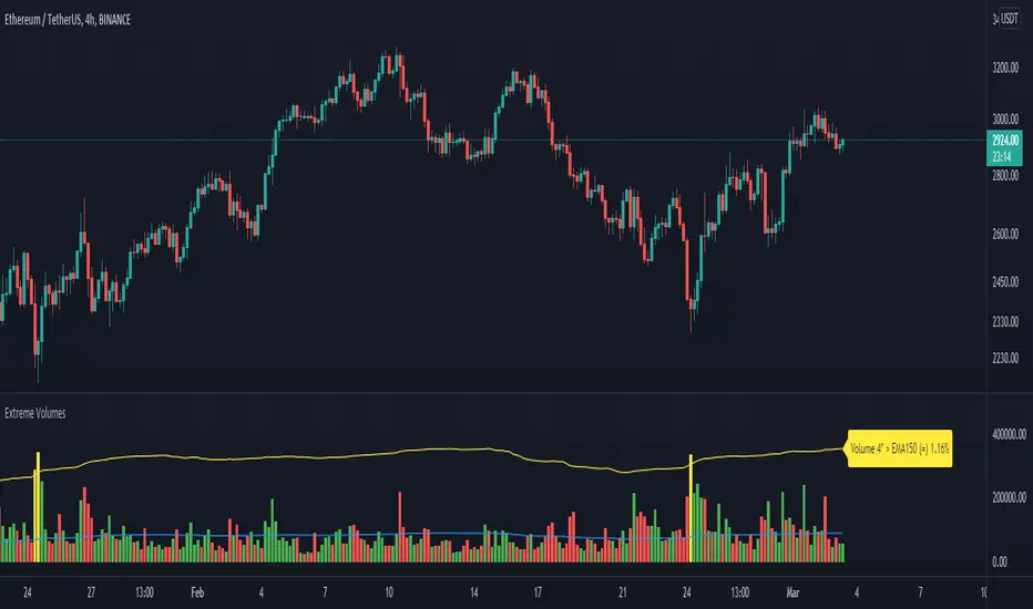 The aim of this volume indicator is quite simple: to pinpoint extreme volume spikes and how unusual these extremes are in comparison to all the chart's volumes.